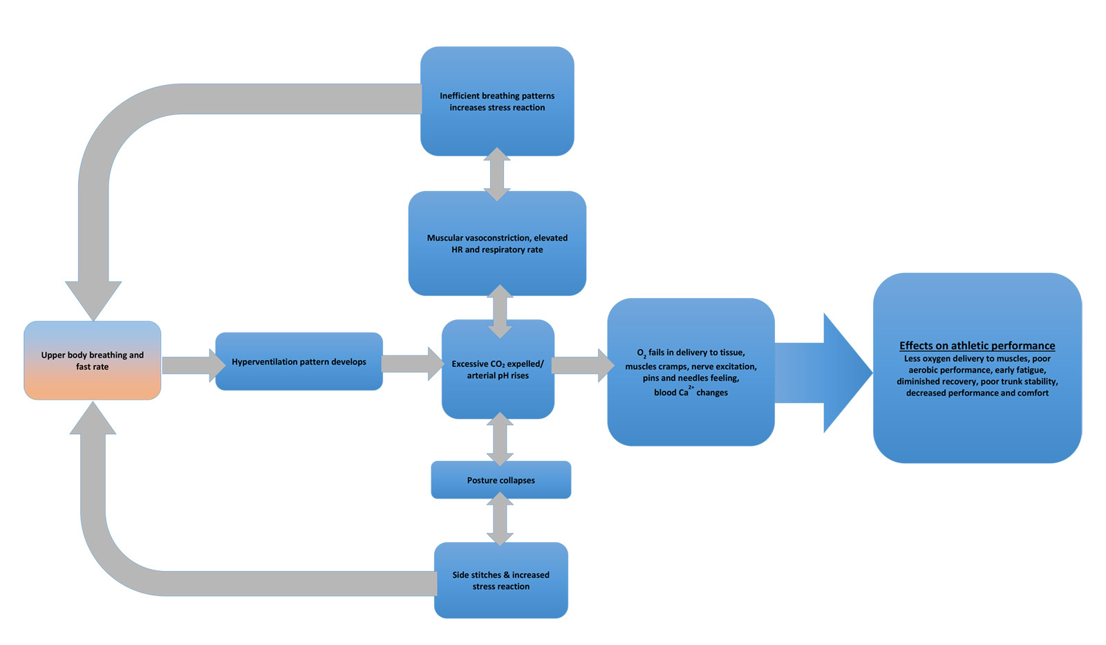 Dysfunctional breathing initiates a cycle in which the body’s nervous system is stimulated towards a fight or flight stress response (Sympathetic), with a cascade of ensuing symptoms. The above chart is a simplified version of one presented by Chaitow, and illustrates the major effects. Stress hormones are released by the adrenal glands, heart rate and contractility increases, posture begins to deteriorate, sweating is increased, and blood vessels constrict among other predictable symptoms. All of these increase anxiety and respiration rate, thus producing a feed forward loop in which the symptoms act to increase the breathing disorder.