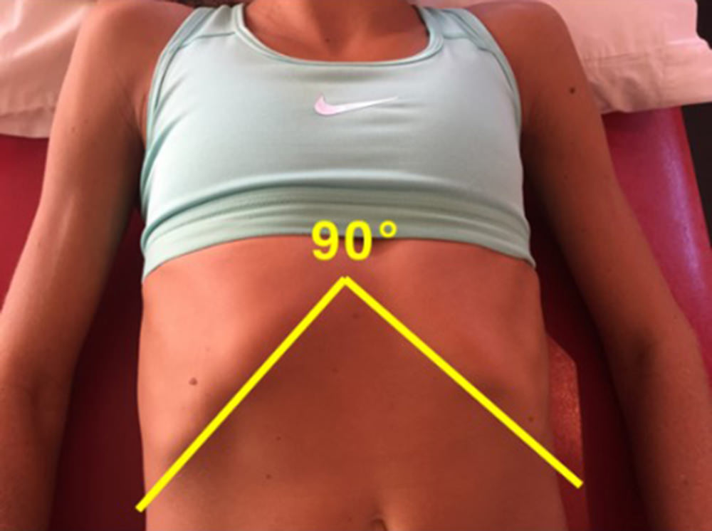 This one is a little harder to do on your own but give it a try. Lying face up, feel the lower border of the lowest ribs, from the lowest part of the sternum out laterally. Appreciate the angle formed by the lower rib lines on each side. Most believe this angle should be around 90 degrees. If abdominal muscles are over active, the angle may be smaller and consequently narrowing that angle.
