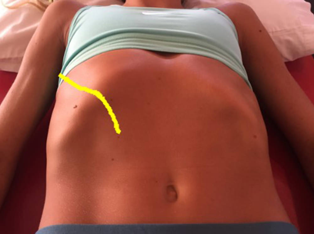 While lying on your back with knees bent and feet flat, feel the lower portion of the ribs just above the abdomen. The ribs should naturally flow into the abdominal musculature (soft tissue). If the bottom edge is easily palpable and appears like a ski jump going downwards off the ribs, this is potentially indicative of hyperinflation pattern (ribs “stuck” upwards). Rib Flaring is often more evident on the left due to our internal organ anatomy. If it’s minimal don’t panic. If it’s pronounced, you’re going to find some valuable information later in this article